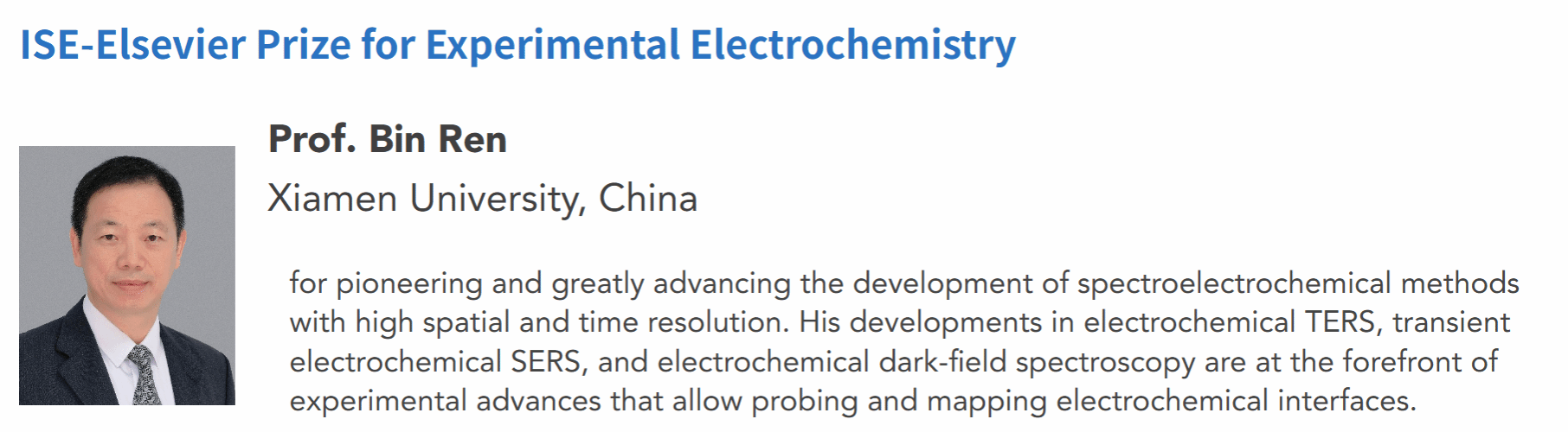 Congratulating to Prof. Ren for obtaining ISE-Elsevier Prize for Experimental Electrochemistry. The ISE-Elsevier Prize for Experimental Electrochemistry may be awarded annually to a person who has made an important contribution to experimental electrochemistry. Prof. Ren obtaining ISE-Elsevier Prize for Experimental Electrochemistry for pioneering and greatly advancing the development of spectroelectrochemical methods with high spatial and time resolution. His developments in electrochemical TERS, transient electrochemical SERS, and electrochemical dark-field spectroscopy are at the forefront of experimental advances that allow probing and mapping electrochemical interfaces.